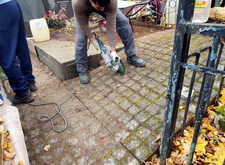 Далее мы приступили к работе над входным проёмом. Ранее он был оформлен горкой, однако мы предложили клиенту вариант с широкой ступенькой, который и был утверждён заказчиком. Для формирования ступеньки нам предстояло для начала демонтировать гранитную брусчатку.